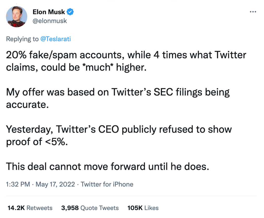 Musk questioned Twitter’s estimation of spam and fake accounts, claiming it’s much higher than he was led to believe.