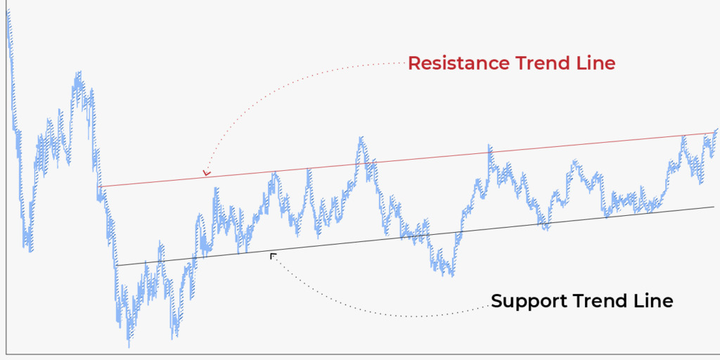 ट्रेंडलाइन का उपयोग वर्तमान ट्रेंड को आकार देने के लिए किया जाता है। जब कीमत एक फ़्रेमयुक्त चैनल के भीतर चलती है, तो संभावित रिबाउंड के स्तर को निर्धारित करना बहुत आसान होता है। ट्रेंडलाइन सपोर्ट और रिज़िस्टन्स लक्ष्य के रूप में काम करते हैं। जब कीमत ट्रेंड चैनल की ऊपरी सीमा पर आती है, तो आप इसके गिरने की उम्मीद कर सकते हैं। इसलिए, आप रिबाउंड होने के बाद एक सेल ट्रेड खोलते हैं। अगर कीमत चैनल की निचली सीमा के पास है, तो कीमत के पलटने के बाद आपको खरीदारी की स्थिति खोलने के लिए तैयार रहना चाहिए।