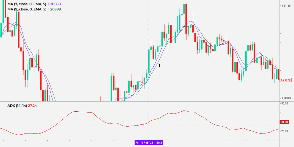 - Um aumento de preço pode ocorrer quando um EMA de 7 períodos se move acima do EMA de 9 períodos, o preço permanece acima da média móvel mais curta, o indicador ADX quebra acima do nível 30 e o preço testa novamente o EMA mais curto (1).