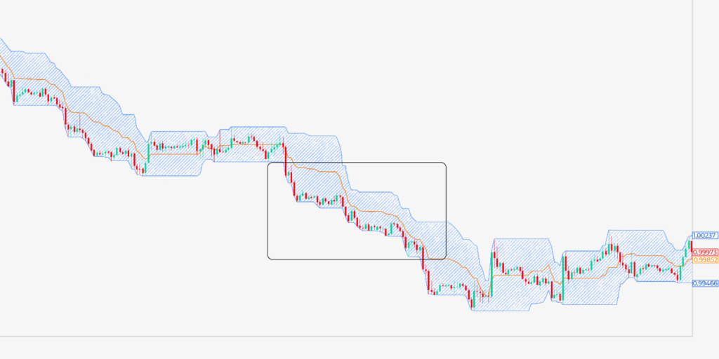Quando o preço está abraçando a banda superior de forma firme e consistente, fazendo novos máximos enquanto o limite inferior se achata, pode-se supor que o momento de alta está presente. Enquanto isso, o oposto também é verdadeiro: o momento de baixa parecerá um limite inferior movendo-se continuamente para baixo enquanto a banda superior permanece plana.