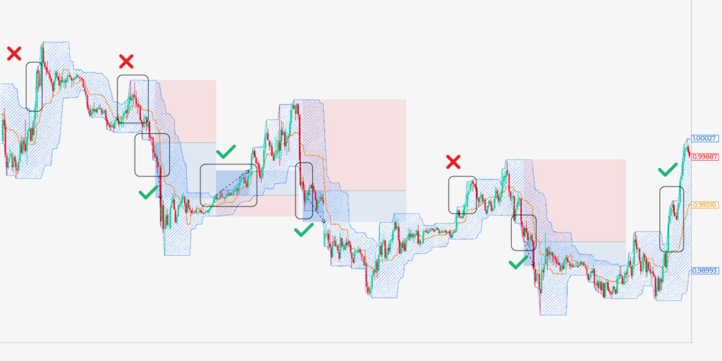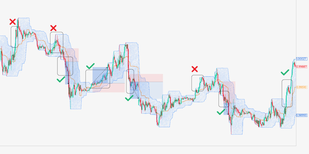 Você consegue identificar o que une cada entrada acima? Primeiro, você notará que o limite superior ou inferior está subindo/descendo rapidamente. Em segundo lugar, essas áreas tiveram três toques consecutivos no limite, indicando que o preço estava continuamente fazendo novos altos/baixos.