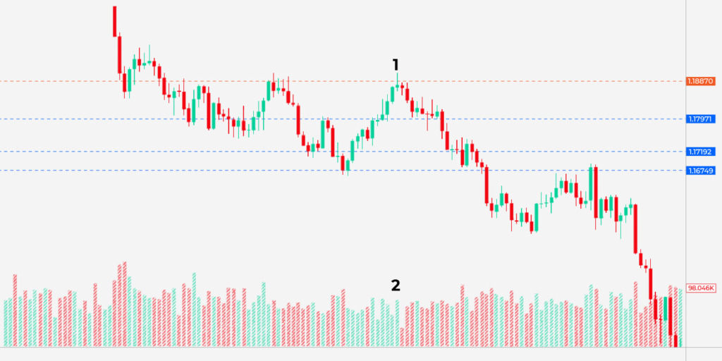 Aşağıdaki grafiğe bakın. Fiyat, güçlü bir direnç seviyesinde düşüş eğilimi gösteren bir fiyat çubuğu (1) oluşturmuş, ancak hacim indikatörüne baktığınızda, yüksek boğa hacmini (2) göreceksiniz. Bu nedenle, piyasada işlem açmak için ek doğrulamaya ihtiyacınız var. Pin çubuğundan sonra fiyatın düşüş eğilimi gösterecek bir mum çubuğu oluşturmasını bekleyin. İkinci pin çubuğu düşüş eğilimi gösteriyorsa, hemen ardından piyasaya girebilirsiniz. Piyasa oynaklığı düşükse direnç seviyesinde ve oynaklık yüksekse pin çubuğunun yüksek seviyesinin üzerinde bir dur emri verin.