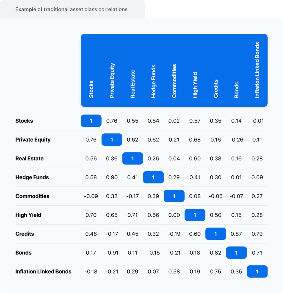 Bu teknikte tarihsel veriler, iki veya daha fazla varlığın arasındaki hareketin ne kadar yakın veya ters olduğunu belirlemek için analiz edilir. Ölçek, -1 ile 1 arasında değişir. 1 mükemmel pozitif korelasyonu, -1 negatif ise korelasyonu ve 0 ise varlıklar arasında ilişki olmadığını gösterir. Örneğin, hisse senetleri emtialarla daha düşük bir korelasyona sahiptir (0.02). Ancak hisse senetli özel sermaye ile daha yüksek bir korelasyona sahiptir (0.76).