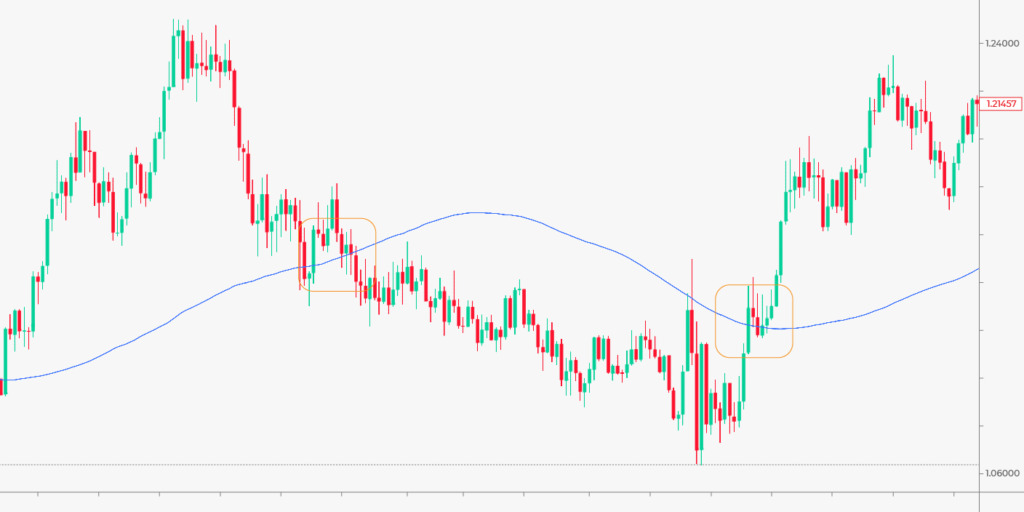 MA’yı destek ve direnç seviyeleri olarak kullanabilirsiniz. Ancak bu sinyal kısa-vadeli zaman aralıklarında daha iyi çalışacaktır. Daha yüksek grafiklerde MA, sınır işlevi görmek üzere fiyattan uzaklaşacaktır.