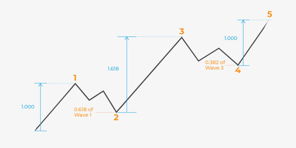 Dalgalar arasındaki mesafe, corrective dalgalar için düzeltmeler ile ve impulse dalgaları için ise uzantılar ile belirlenir. Tüccarlar genellikle 2. dalgayı bulmak için 1. dalganın 0,618’lik düzeltmesini kullanır. 3. Dalga, 1. dalganın 1,618 Fibonacci uzantısında görünür. 4. Dalga genellikle sığdır – 3. dalganın 0,382’si civarında geri döner.