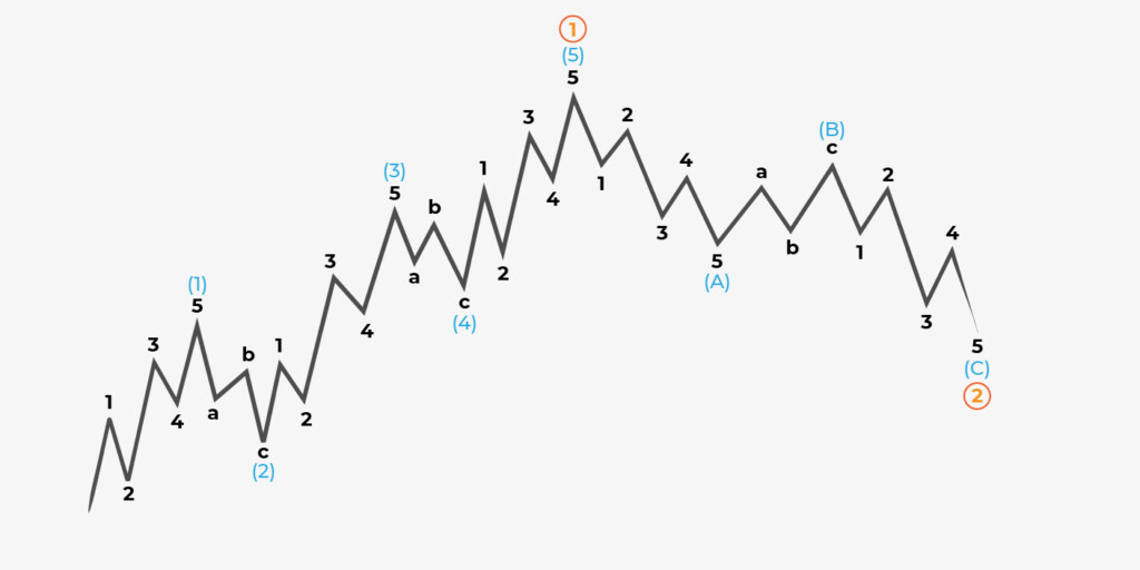 Aşağıda, en yüksek dereceli (1) impulse dalgasının ve en yüksek dereceli (2) corrective dalgası ile nasıl daha küçük dereceli dalgalara bölündüğünü görebilirsiniz.