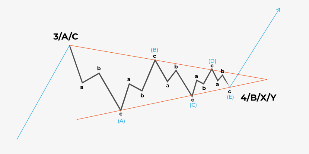 Üçgen, 4.dalgada veya bir ABC düzeltmesinin corrective dalgası olan B’sinde oluşturulabilen beş dalgalı bir kurulumdur. Üç tür üçgen vardır; simetrik, azalan ve artan. Her üçgenin dalgası ise üç dalgaya bölünür.