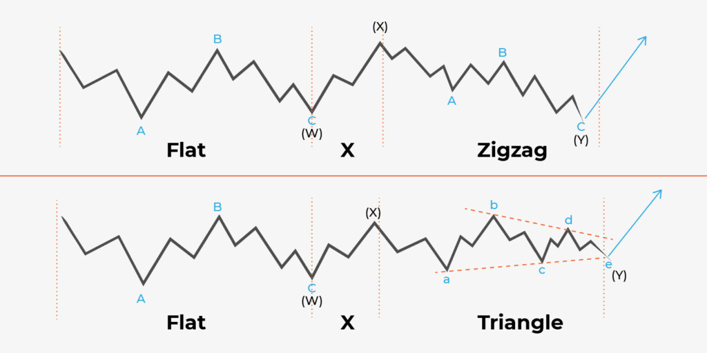 İkili üçlü ve üçlenmiş üçlü kombinasyonlar, yukarıda bahsettiğimiz tüm düzeltmelerin birleştiği en karmaşık düzeltmelerdir. İkili üçlü kombo, WXY’dan etiketlenir ve üçlenmiş üçlü kombo ise WXYXZ’dan etiketlenir. Bunlar, çok sayıda sivri uç oluşturan yan aralıklardır. Genelde 4.dalgada görülürler.
