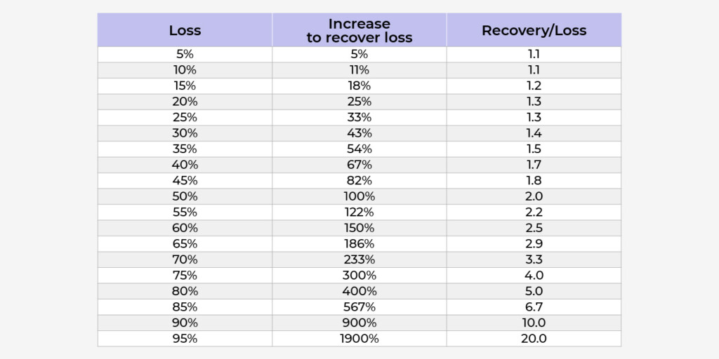 Bu tablo, önceki tüm kaybedilen işlemleri karşılamak için bir işlemin ne kadar getirmesi gerektiğini gösterir. Örneğin, başlangıç miktarının %35’ini kaybettikten sonra bir depozitoyu geri almak için mevcut bakiyenin %54’ünü iade etmesi gerekecektir.