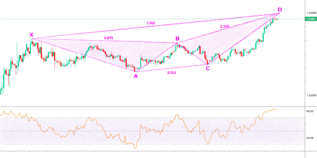 Aşağıda, GBP/USD fiyat tablosunda oluşan düşüş eğilimi gösteren bir kelebek modelini temsil eden bir grafik yer almaktadır. Grafiğin altındaki RSI göstergesinin aşırı alım seviyelerini gösteren düşüş onayını not edin.